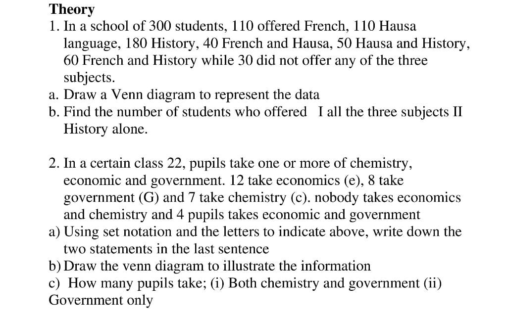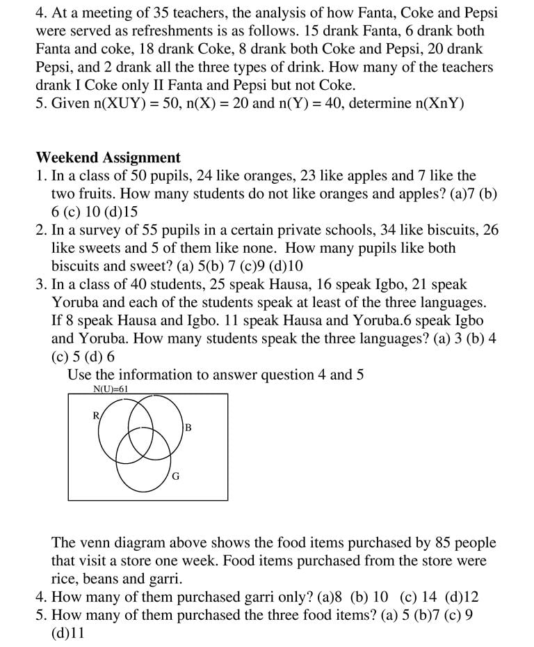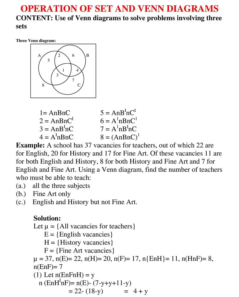 OPERATION OF SET AND VENN DIAGRAMSMr. Fijabi W. YJuly 24, 2022SS 1 Further Mathematics Notes (1st, 2nd & 3rd Term), Further Mathematics Lesson Note For All Classes OPERATION OF SET AND VENN DIAGRAMS See also BASIC CONCEPT OF SET LOGARITHM INDICIAL AND EXPONENTIAL EQUATIONS INDICES Trigonometric Identities and graphs